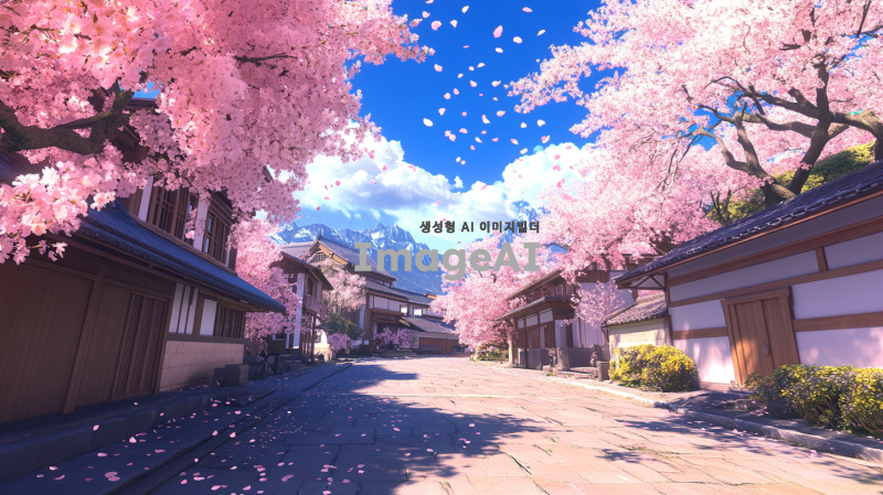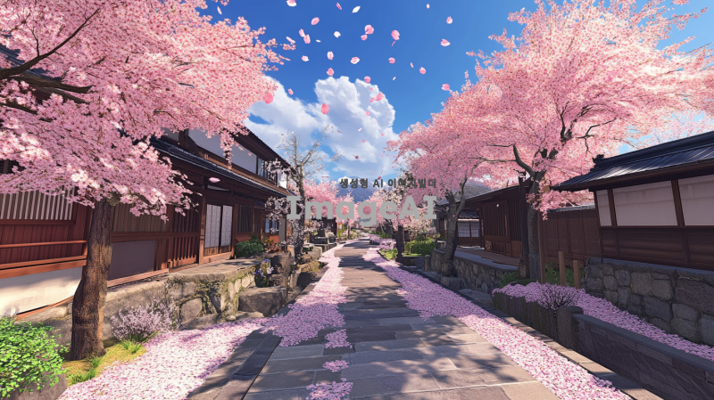 이미지 생성 부탁 일본 전통 교토의 만발한 벚나무, 벚꽃잎, 벚꽃잎은 ffd9e5, ffe4e1 정도의 색상, 명도로 해주고 벚꽃은 꽃잎이 5개란다. 그리고 흩날리는 벚꽃잎은 반드시 한 잎이어야 하고 끝부분이 진짜 벚꽃처럼 갈라져있어야 해