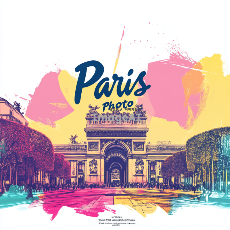 파리의 아름다운 풍경과 유명한 랜드마크들이 어우러진 포스터 디자인, 화사한 색감과 예술적인 요소를 강조하여 현대적인 감각을 살린 스타일, "파리포토"라는 텍스트를 중앙에 배치하고 세련된 폰트를 사용하여 시선을 끌도록 구성, 배경에는 파리 그랑팔레를 포함, 전체적으로 매력적인 분위기를 연출. 인스타그램 포스팅 사이즈로