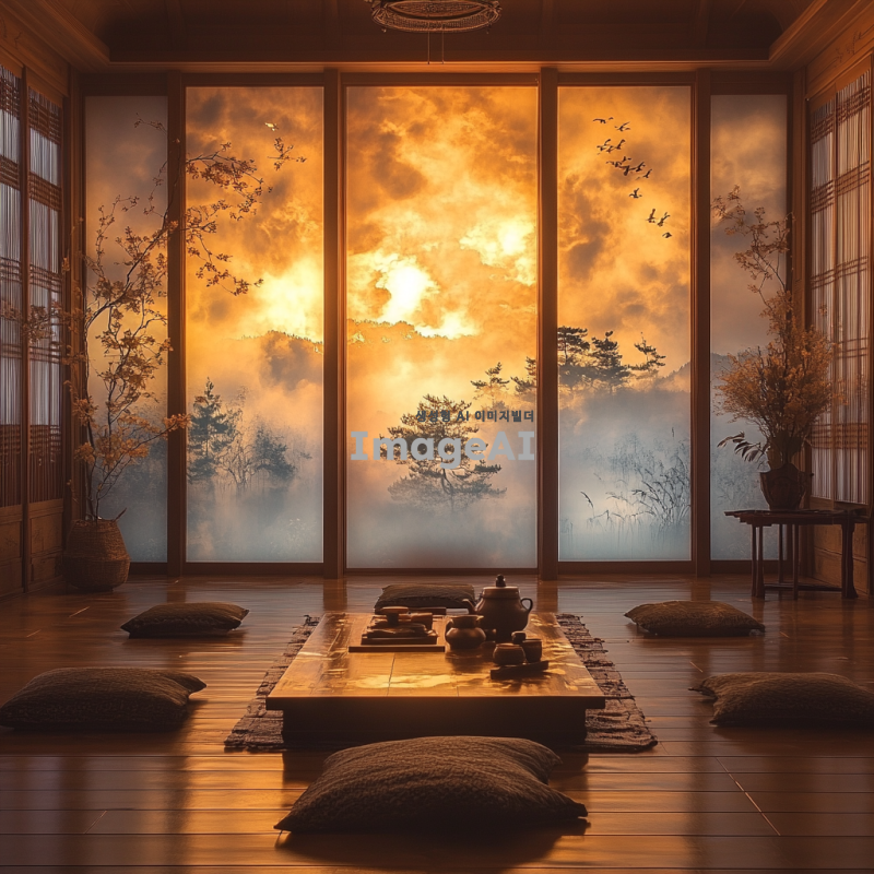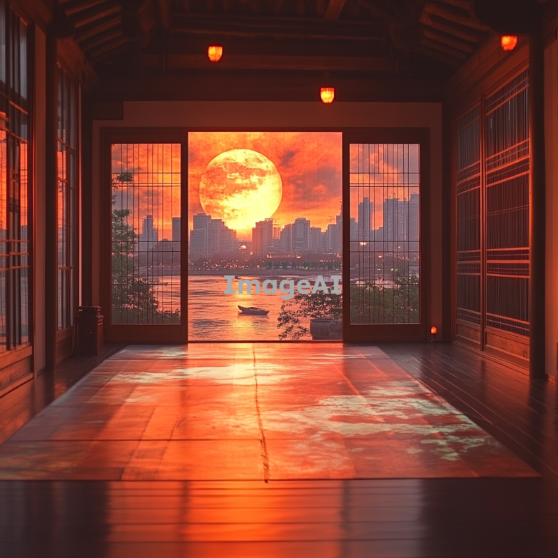 한국의 전통 문풍지 뒤에서 흐릿하게 비디오가 재생되고 있는 장면, 비디오는 색감과 형태로만 표현되며, 문풍지의 섬세한 질감과 패턴이 강조된 이미지. 조명은 부드럽고 따뜻한 느낌을 주며, 전체적인 분위기는 아늑하고 몽환적이다.