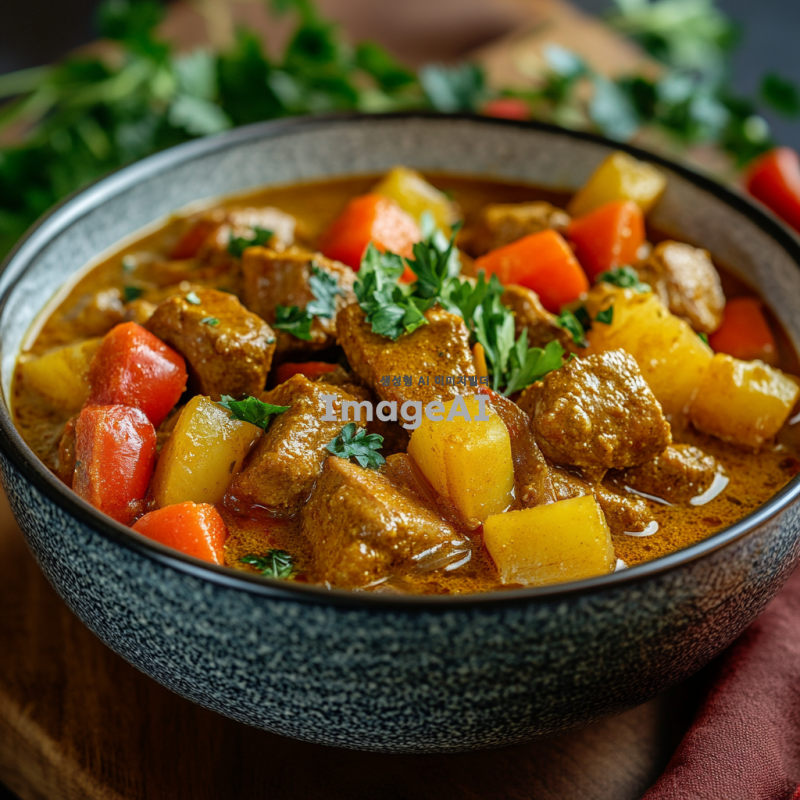 돼지등심 고기가 들어간 카레의 이미지를 생성하기 위해, 풍성한 재료와 함께 맛있게 조리된 카레를 담은 그릇을 중심으로 하여, 고소한 향이 나는 카레의 색감과 질감을 강조한다. 배경은 아늑한 주방이나 식탁으로 설정하고, 카레 위에 신선한 채소와 고기 조각들이 잘 보이도록 배열한다.
