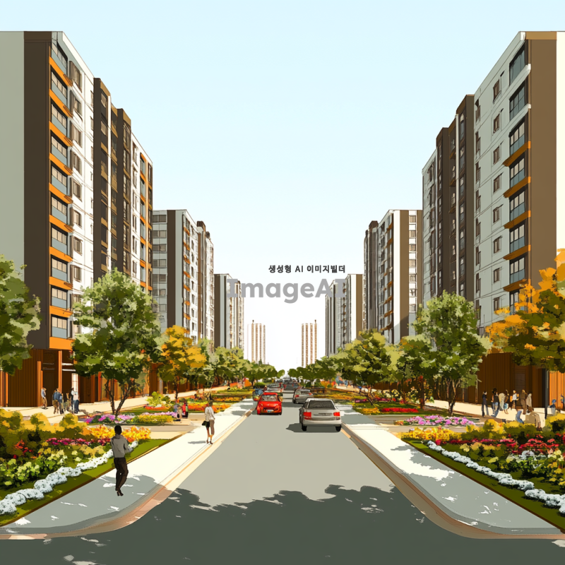 독립문처럼 가운데 차가 다닐 수 있는 길이 뚫려 있는 아파트 동의 외관을 그려줘. 아파트는 현대적인 디자인으로, 양쪽에는 녹색의 나무와 화단이 조화롭게 배치되어 있으며, 하늘은 맑고 햇살이 비치고 있다. 아파트 동의 중앙에는 넓은 도로가 있어 차량이 통행할 수 있고, 주변에는 사람들이 산책하거나 대화하는 모습이 보인다. 전체적인 분위기는 평화롭고 아늑하며, 도시의 활기를 느낄 수 있는 장면을 담아줘.