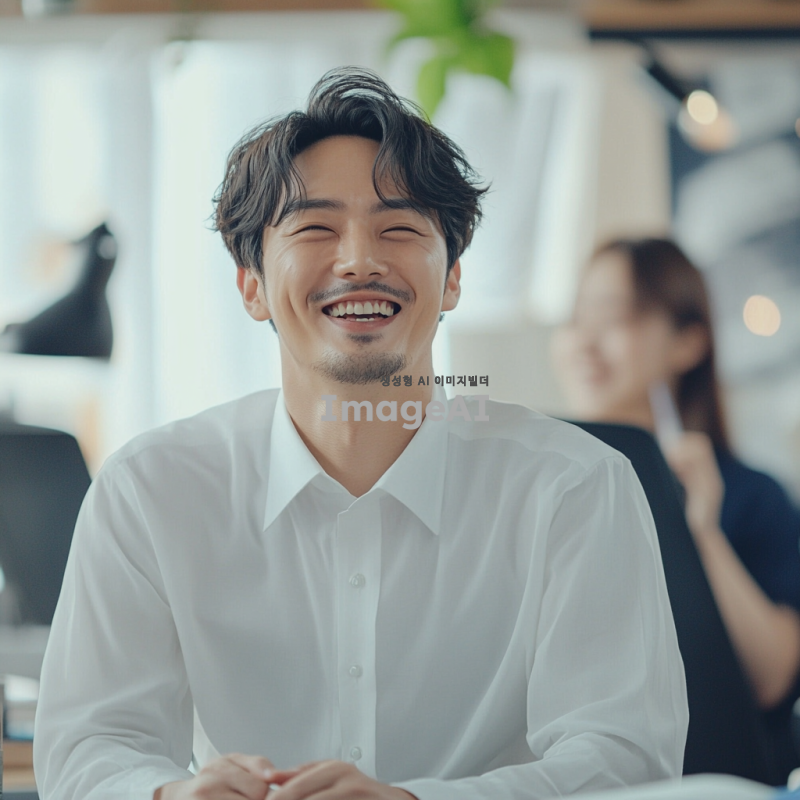 사무실에서 일하고 있는 한국인 남성이 결혼에 대한 생각이 없다는 내용을 담은 장면. 그는 동료들과 함께 웃으며 대화하고 있고, 주변에는 결혼식 사진이나 웨딩 관련 소품들이 있지만 그는 그에 대해 무관심한 표정을 짓고 있다. 배경은 현대적인 사무실 환경으로, 편안한 분위기를 연출한다.