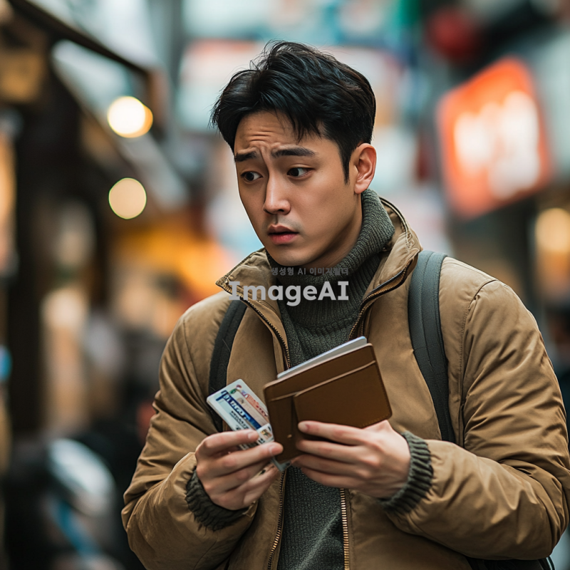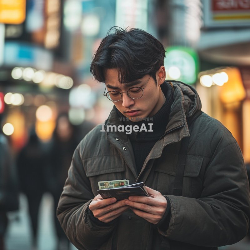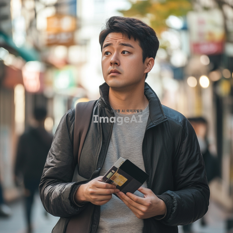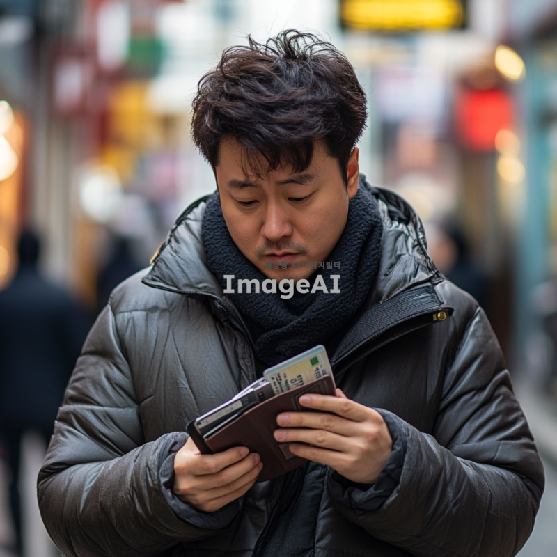 돈을 들고 다니기 불편한 한국인 남성이 지갑을 열어보며 고민하는 모습, 주변에 다양한 결제 수단이 있는 도시 거리, 현대적인 분위기, 실용적인 패션을 입고 있는 모습, 불편함을 표현하는 표정, 자연광이 비치는 장면.