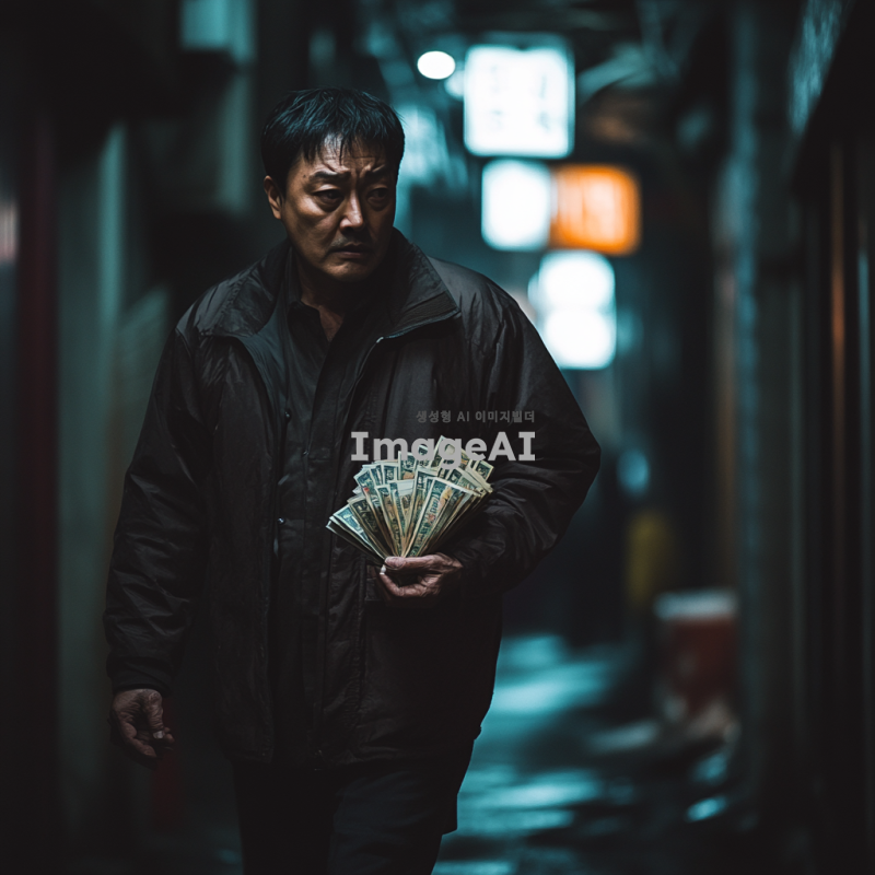 어두운 골목길을 걷고 있는 한국인 남성, 손에 돈다발을 쥐고 있지만 불안한 표정을 짓고 있는 모습, 주변은 음산한 분위기로 가득 차 있고, 그 남성의 시선은 주위를 경계하는 듯한 느낌, 배경에는 불빛이 희미한 가로등과 그림자가 드리워진 벽, 돈의 무게와 불안함을 동시에 느끼게 하는 장면.