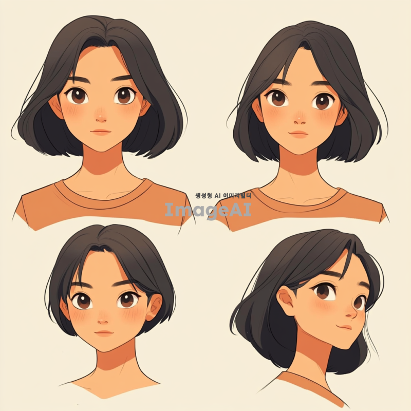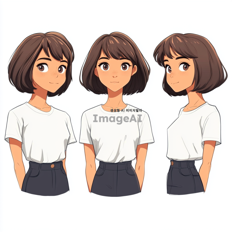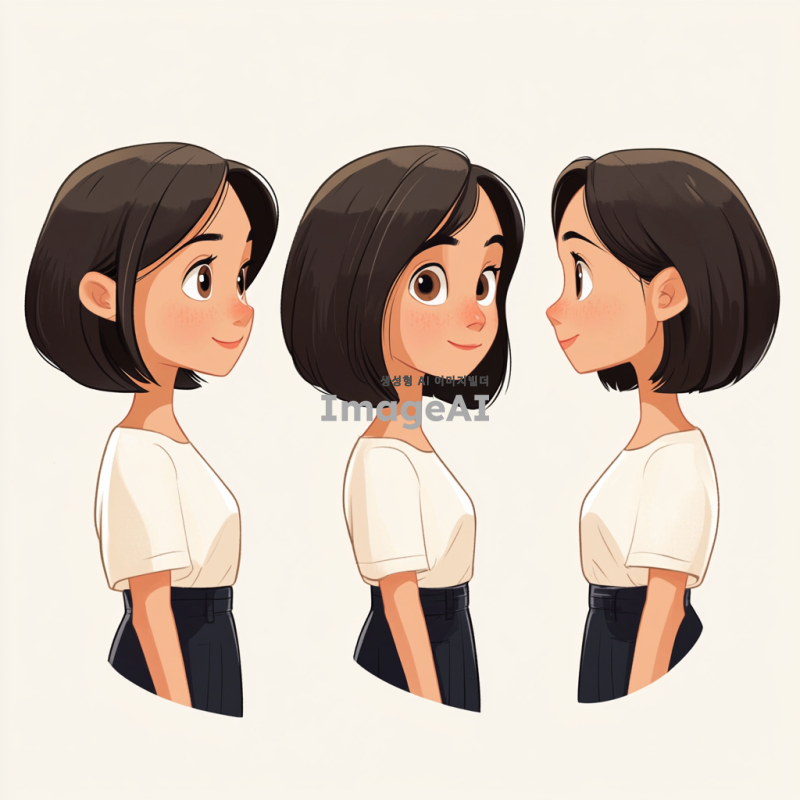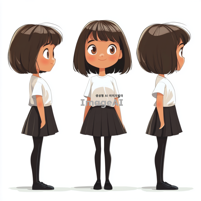 2d 단발머리 여자아이를 머리부터 발끝까지 정면, 완전측면, 반측면 각도에 따라 다른동작으로 3가지 이미지 만들어줘