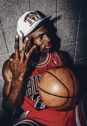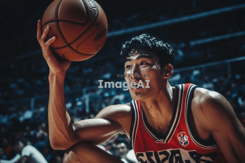 한국의 농구선수가 코트에서 드리블을 하며 점프슛을 시도하는 모습, 뒷 배경에는 관중들이 가득 차 있는 농구 경기장, 선수는 팀 유니폼을 입고 있으며, 강렬한 표정과 역동적인 자세로 운동의 긴장감을 표현하고 있음.