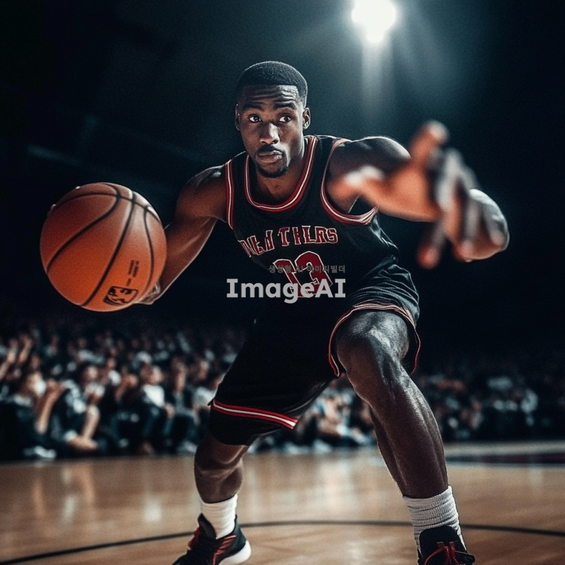 검은색 농구 유니폼을 입고 있는 흑인 남성 농구선수가 역동적으로 드리블하는 모습. 배경은 농구 코트로, 관중들이 응원하는 모습이 보인다. 선수의 표정은 집중하고 있으며, 근육질의 몸매가 잘 드러나도록. 조명은 코트 위에 집중되어 있고, 공중에서 농구공이 날아가는 장면을 포착.