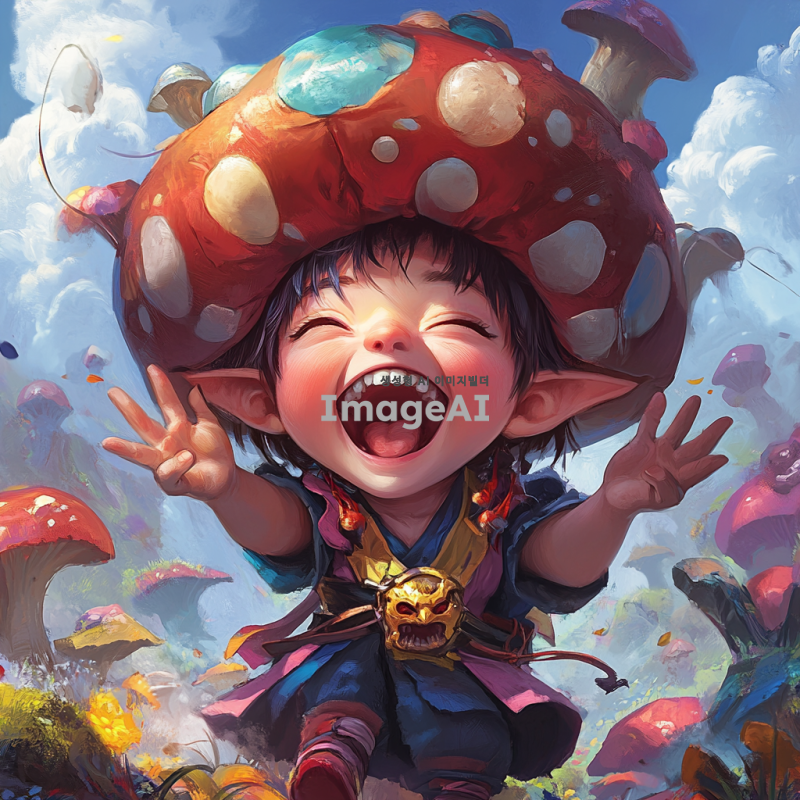 라바돈의 죽음모자를 쓴 한국인 리신이 병맛스럽게 웃고 있는 모습, 화려한 색감과 과장된 표정, 귀여운 스타일로 그려진 리신, 배경은 만화 같은 느낌의 환상적인 풍경, 유머러스한 요소가 가득한 장면.