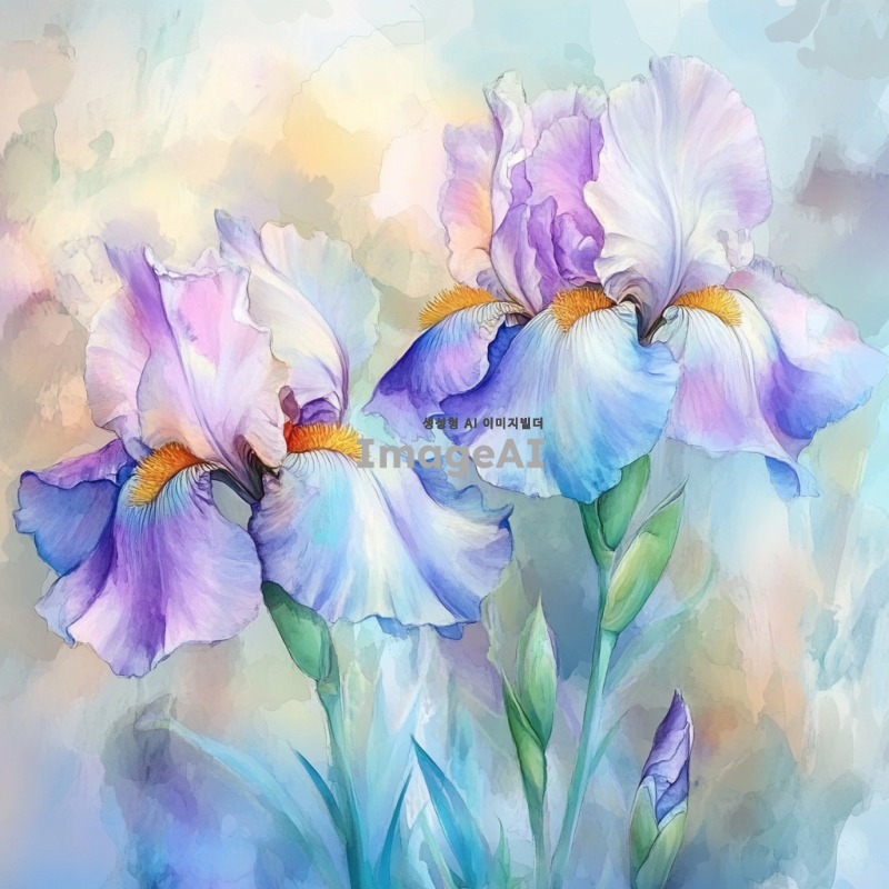 붓꽃이 만개한 모습이 수채화 스타일로 표현된 그림, 부드러운 색감과 흐릿한 경계선, 자연의 아름다움을 강조하며 향수 용기에 잘 어울리도록 디자인된 이미지.