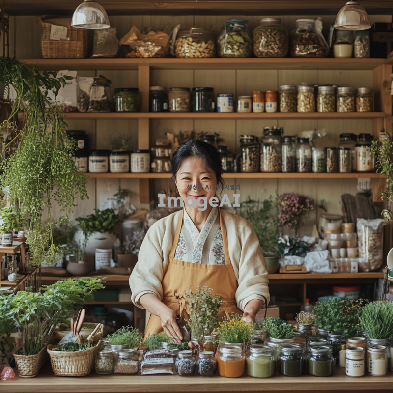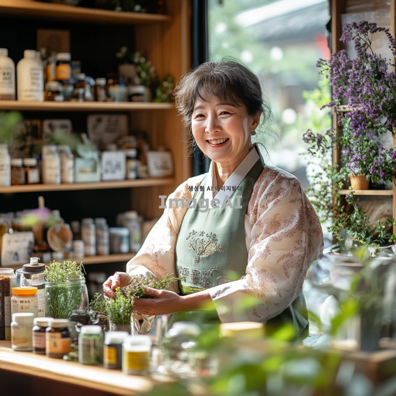 복순이네 약초이야기의 따뜻한 분위기를 담은 이미지, 한국의 전통 약초를 판매하는 작은 가게의 내부 모습, 다양한 약초와 한약재가 진열된 선반, 자연광이 들어오는 아늑한 공간, 복순이라는 이름의 중년 여성 주인이 약초를 손질하고 있는 모습, 전통 한복을 입고 미소 짓고 있는 모습, 주변에 자연을 느낄 수 있는 식물들, 편안하고 친근한 느낌의 색감.