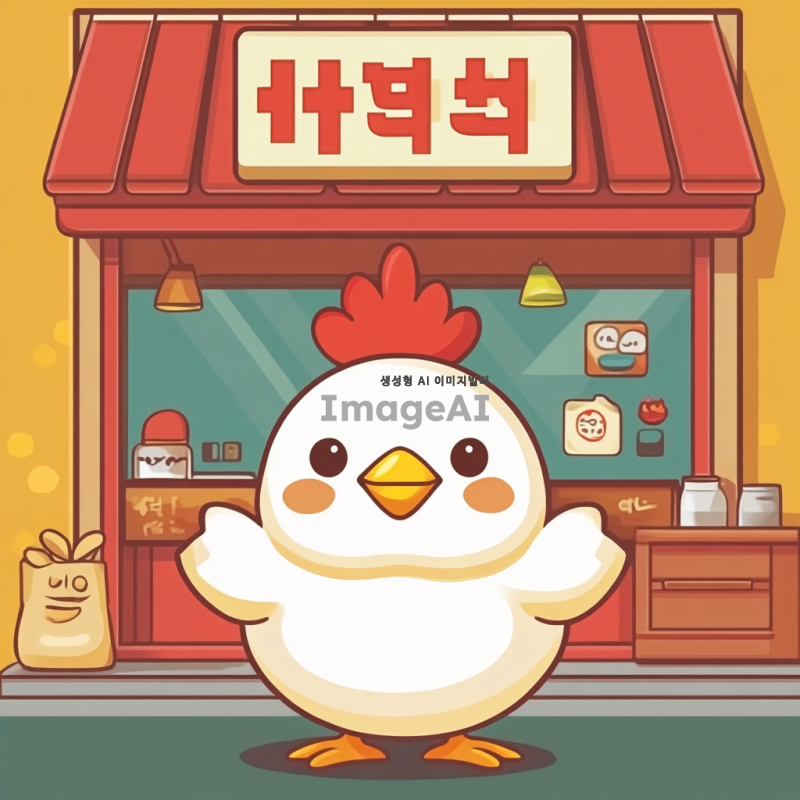 90도 인사하는 한국인 치킨 캐릭터, 귀여운 표정, 밝고 따뜻한 색감, 배경은 간단한 식당 환경, 치킨이 인사하는 모습 강조, 아기자기한 스타일