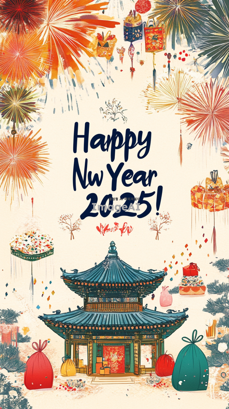 2025년 새해를 맞아 한국의 전통적인 요소와 현대적인 감각이 조화를 이루는 인사 카드 디자인. 배경은 화려한 색감의 불꽃놀이와 함께 새해를 축하하는 분위기로 가득 차 있으며, 카드 중앙에는 "2025년 새해 복 많이 받으세요!"라는 인사말이 아름다운 서체로 적혀있고, 주변에는 복주머니, 떡국, 소원 나무 등의 한국 전통 아이콘이 배치되어 있는 이미지.