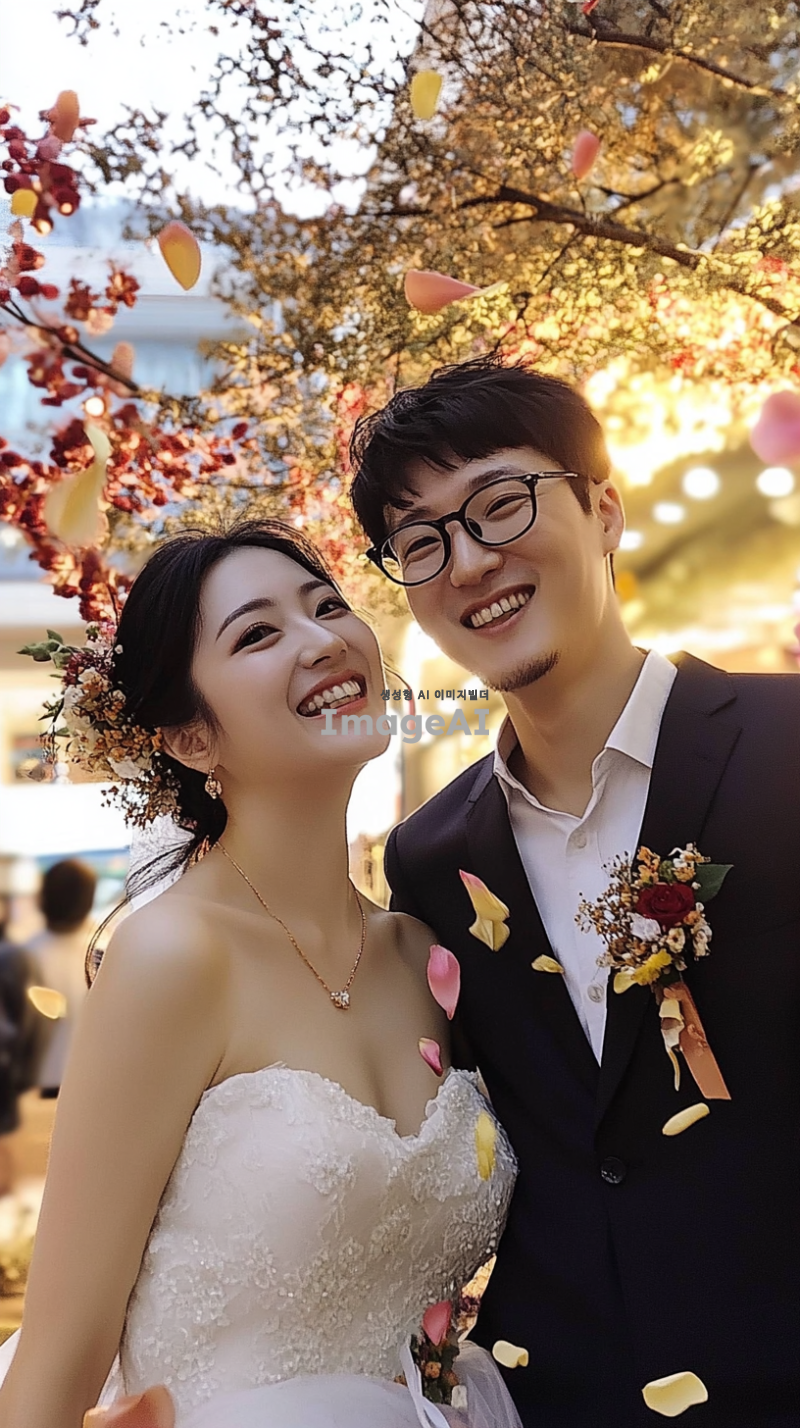 한국인 신랑과 신부가 서로를 바라보며 미소 짓고 있는 모습, 주변에는 가족과 친구들이 축하하는 분위기, 아름다운 꽃 장식과 전통적인 결혼식 소품들, 따뜻한 햇살 아래에서 행복한 순간을 나누는 장면.