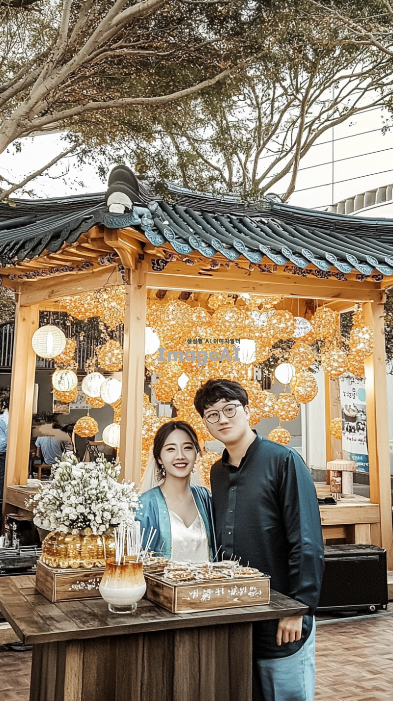 한국인 신랑과 신부, 전통 혼례식이 진행되는 아름다운 정원, 꽃과 나무로 장식된 세팅, 행복한 가족과 친구들이 둘러싸고 있는 모습, 따뜻한 햇살과 푸른 하늘, 전통 음식과 장식이 있는 테이블, 사랑과 기쁨이 넘치는 분위기.