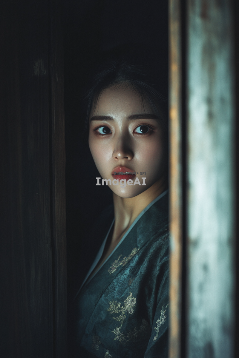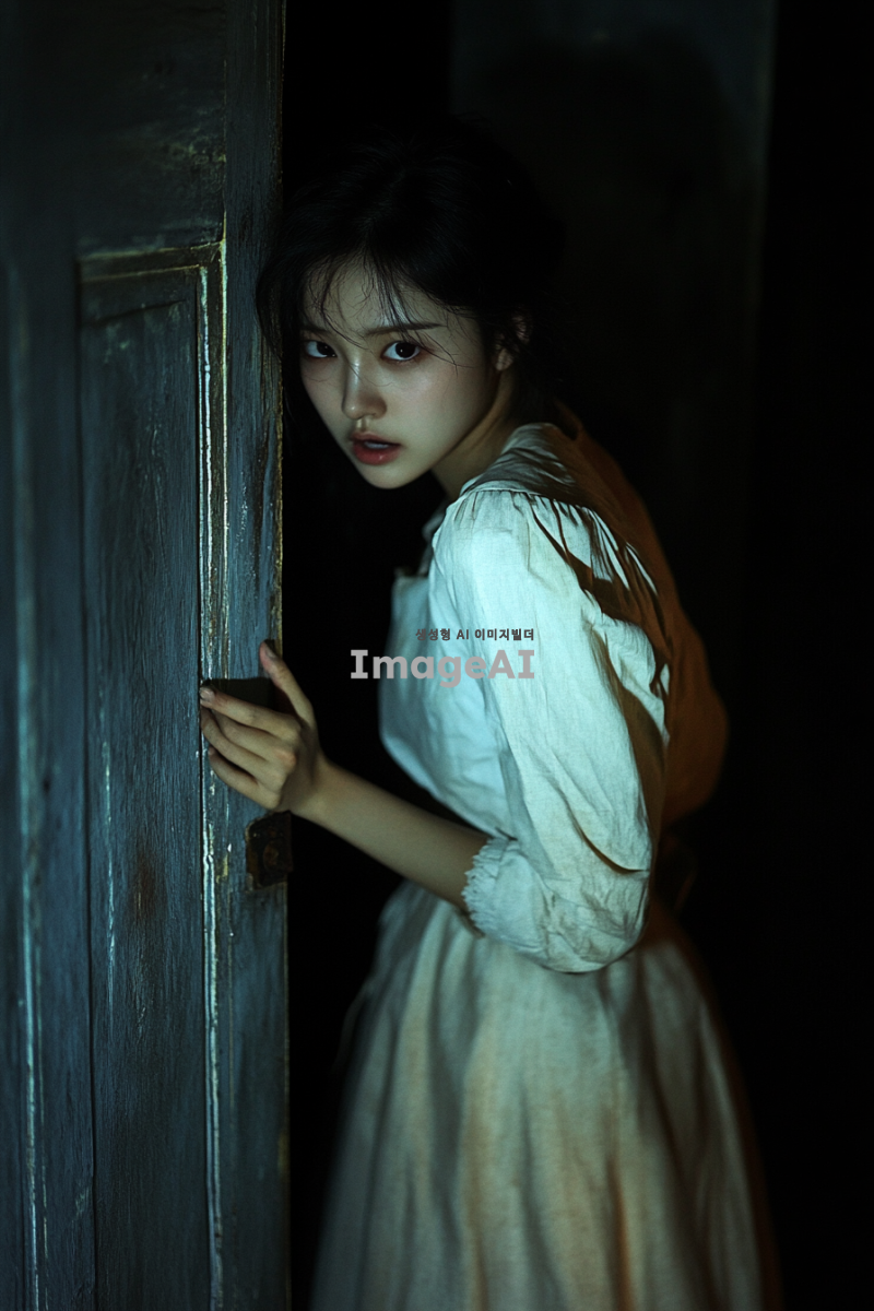 한국인 여성, 어딘가에 감금되어 있는 모습, 탈출하기 위해 문을 마구 두드리는 장면, 다급하고 간절한 표정, 예쁜 복장, 긴장감 넘치는 분위기, 어두운 방 안에서의 절박한 상황