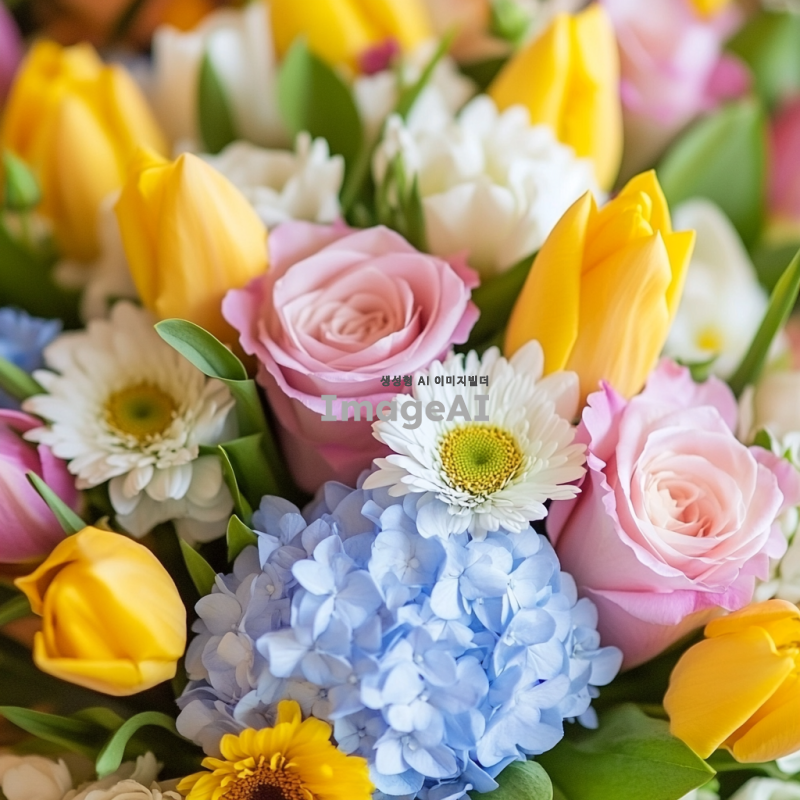 다양한 색상의 화려한 꽃들이 가득 담긴 아름다운 꽃다발, 연한 핑크색 장미, 노란색 튤립, 파란색 수국, 흰색 국화, 그리고 초록색 잎사귀들이 조화롭게 어우러진 모습, 부드러운 자연광 속에서 촬영된 느낌, 우아하고 생동감 있는 배경.