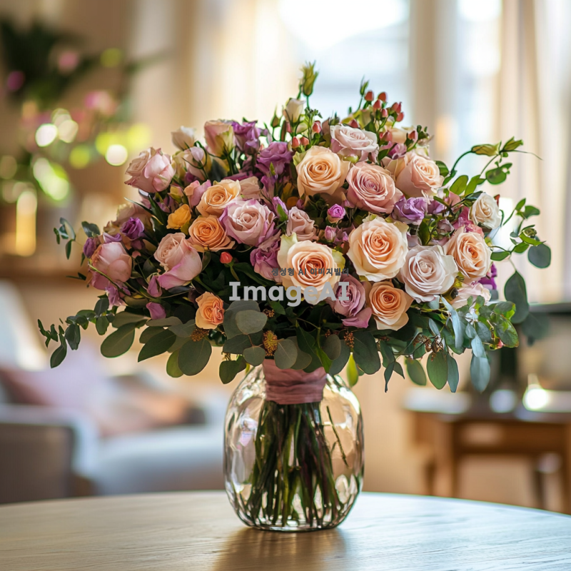 테이블 위에 놓인 화병에 화려하게 꽃힌 고급스러운 꽃다발, 다양한 색상의 꽃들이 조화롭게 어우러져 있는 모습, 부드러운 자연광이 비추는 분위기, 세련된 인테리어 배경, 고급스러운 느낌을 강조한 장면.