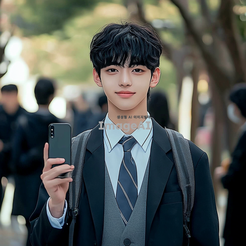 중학교 교복을 입고 증사를 찍고있는 남학생
