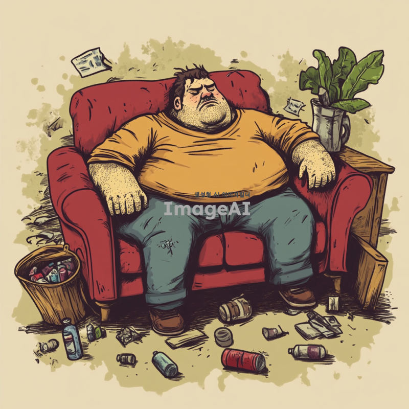 뚱뚱하고 냄새나는 남성이 소파에 앉아있고 주위 물건도 관리를 하지 않아 냄새가 심함. 그림체는 2d에 만화, 일러스트 같은 그림체
