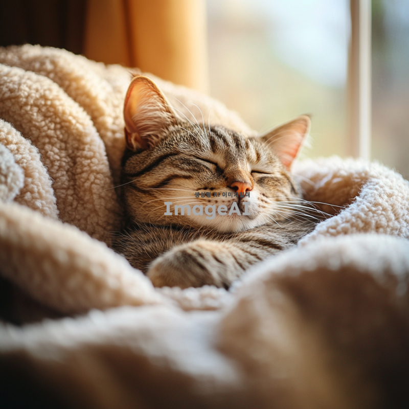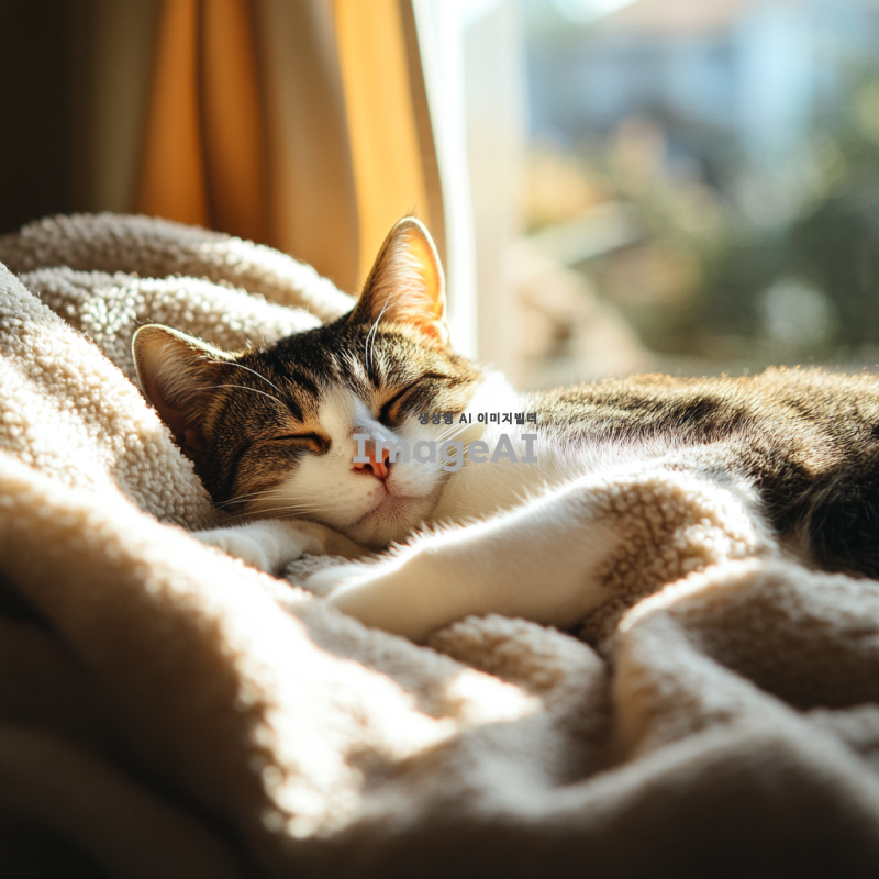고양이가 편안하게 자고 있는 모습, 부드러운 이불 위에 누워 있는 귀여운 고양이, 햇살이 비치는 창가에서 꿈꾸는 듯한 표정, 따뜻한 색감과 아늑한 분위기, 고양이의 털이 부드럽고 윤기 나는 모습, 배경은 아늑한 방의 인테리어로 설정.