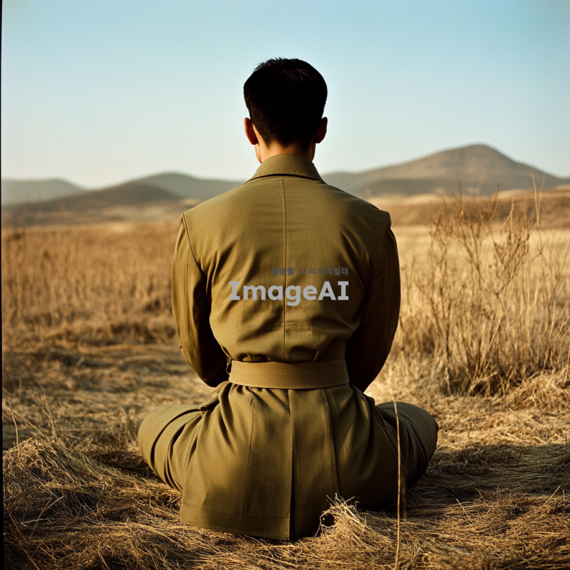20세 한국 남자가 군복을 입고 무릎을 꿇고 엎드려 절하는 모습의 뒷모습, 긴 바지를 입고 있으며 근육질의 긴 다리를 가진 모습, 배경은 자연 풍경으로 설정, 조명은 부드럽고 따뜻한 느낌.
