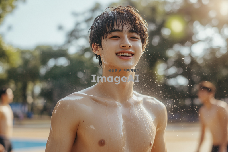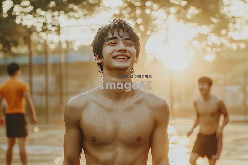 잘생긴 16살 한국 남학생이 농구를 마친 후 더위에 지쳐 상의를 탈의하고 땀을 흘리며 미소 짓고 있는 모습. 배경은 농구 코트로, 햇빛이 강하게 비추고 있고, 주변에 농구공과 친구들이 있는 장면.