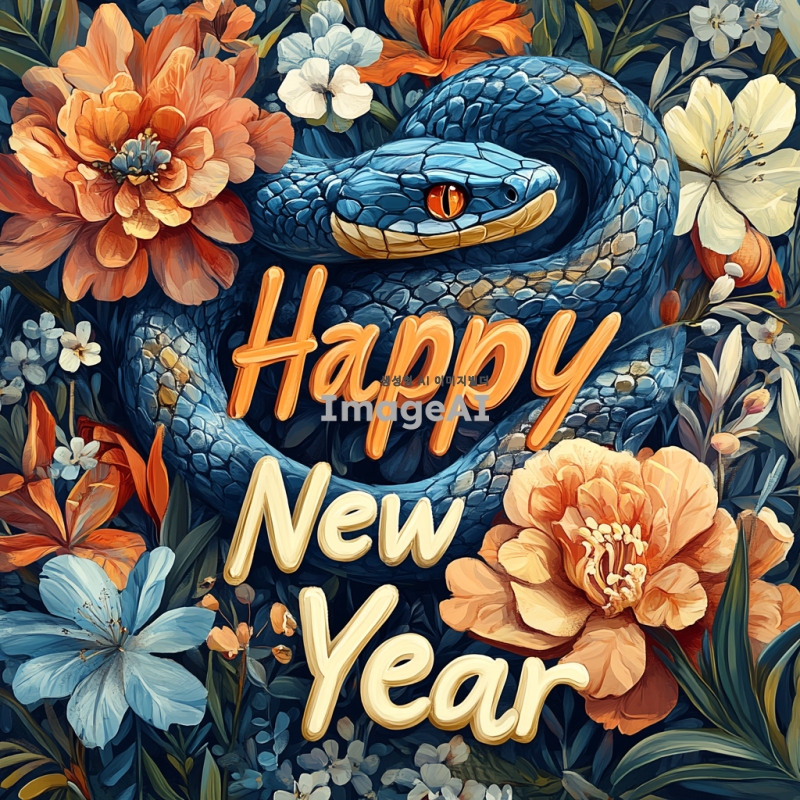 파란색 꽃무늬 뱀을 중심으로 2025라는 숫자를 디자인하고, 그 아래에 "새해 복 많이 받으세요."라는 문구를 넣은 이미지. 뱀의 세부 묘사와 꽃무늬의 아름다움이 강조되도록 구성. 배경은 부드러운 색조로 조화롭게 어우러지게 연출.