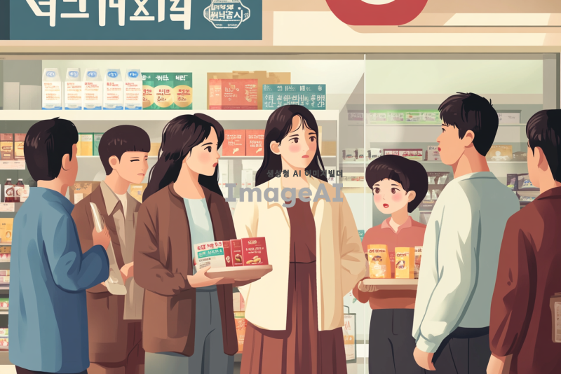 소비자들이 기업의 제품에 대해 비판하는 장면, 다양한 연령대와 성별의 한국인 소비자들이 모여서 불만을 이야기하고 있는 모습, 배경에는 기업 로고가 보이는 상점이나 광고판, 소비자들의 표정은 진지하고 불만이 가득한 모습, 손에 제품을 들고 있거나 불만을 나타내는 피켓을 들고 있는 모습, 주변에는 사람들이 관심을 가지고 지켜보는 장면.