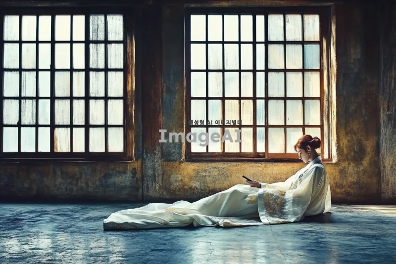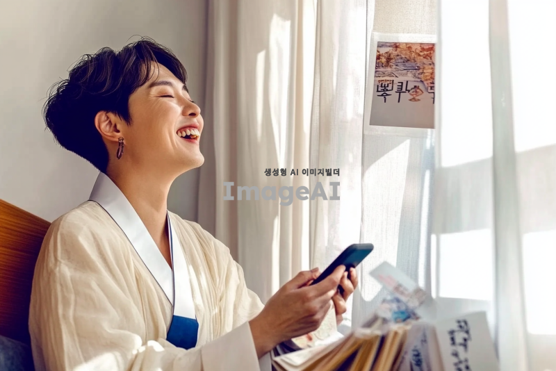 하얀 한복을 입고 나태하게 핸드폰을 보는 이순신, 현대적인 배경 속에서 편안한 자세로 앉아 있는 모습, 부드러운 조명 아래에서 고요한 분위기를 연출, 전통과 현대의 조화, 한국적인 요소가 가미된 장면.