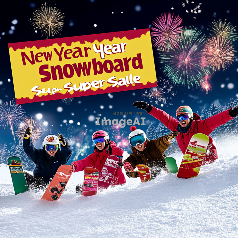 눈 덮인 산에서 스노보드를 타고 있는 한국인들, 화려한 스노보드 장비와 함께 즐거운 표정으로 새해를 맞이하는 모습, 배경에는 새해를 축하하는 불꽃놀이와 함께 "새해맞이 스노보드 슈퍼세일"이라는 텍스트가 적힌 배너, 밝고 경쾌한 분위기.