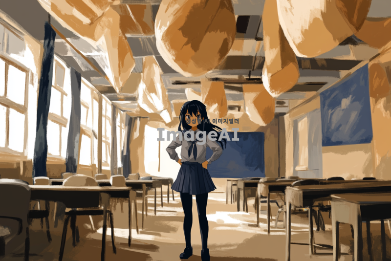 한 여학생이 자신감 넘치는 표정으로 가오를 부리며 서 있는 모습. 그녀는 긴 검은 머리를 가지고 있고, 교복을 입고 있다. 배경은 학교 교실로, 책상과 칠판이 보인다. 여학생의 자세는 당당하고, 손은 허리에 두고 있다. 그녀의 눈빛은 강렬하고, 미소를 지으며 자신을 표현하고 있다.