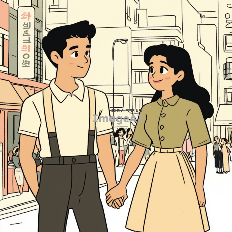 현대 도시 배경에서 서로 손을 잡고 있는 두 캐릭터의 모습. 캐릭터들은 한국인으로, 친근하고 따뜻한 표정을 지으며 서로를 바라보고 있다. 주변에는 현대적인 건물과 다양한 사람들로 가득한 거리 풍경이 보인다. 캐릭터들의 의상은 세련되고 캐주얼하며, 자연스러운 포즈로 서로의 손을 잡고 있는 모습이 강조되어 있다.