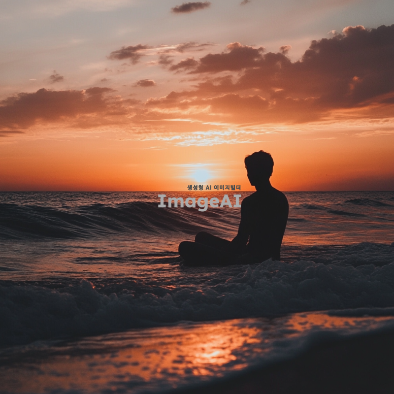 노을이 지는 바닷가, 따뜻한 오렌지와 보라색 하늘, 잔잔한 파도가 밀려오는 풍경, 멀리서 보이는 사람의 실루엣, 고요하고 평화로운 분위기, 자연의 아름다움이 강조된 장면