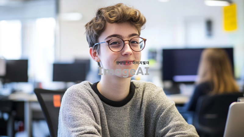 젊은이 한 명이 회사의 로고가 있는 사무실에서 열정적으로 일하고 있는 모습, 밝은 표정과 함께 미래를 향한 희망적인 포부를 가지고 있는 장면, 현대적인 사무 환경과 다양한 기술 장비들이 배경에 있는 이미지.