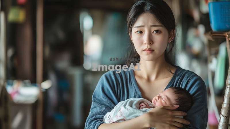 갓난 아기를 품에 안고 육아에 지쳐 보이는 한국인 여성의 모습. 피곤한 표정과 함께 아기를 돌보며 일상적인 집안 배경이 함께 어우러진 장면. 여성의 머리카락은 자연스럽게 흘러내리고, 편안한 옷을 입고 있으며, 아기는 귀여운 포즈로 엄마를 바라보고 있음. 따뜻한 조명 아래에서 가족의 사랑과 헌신이 느껴지는 순간.