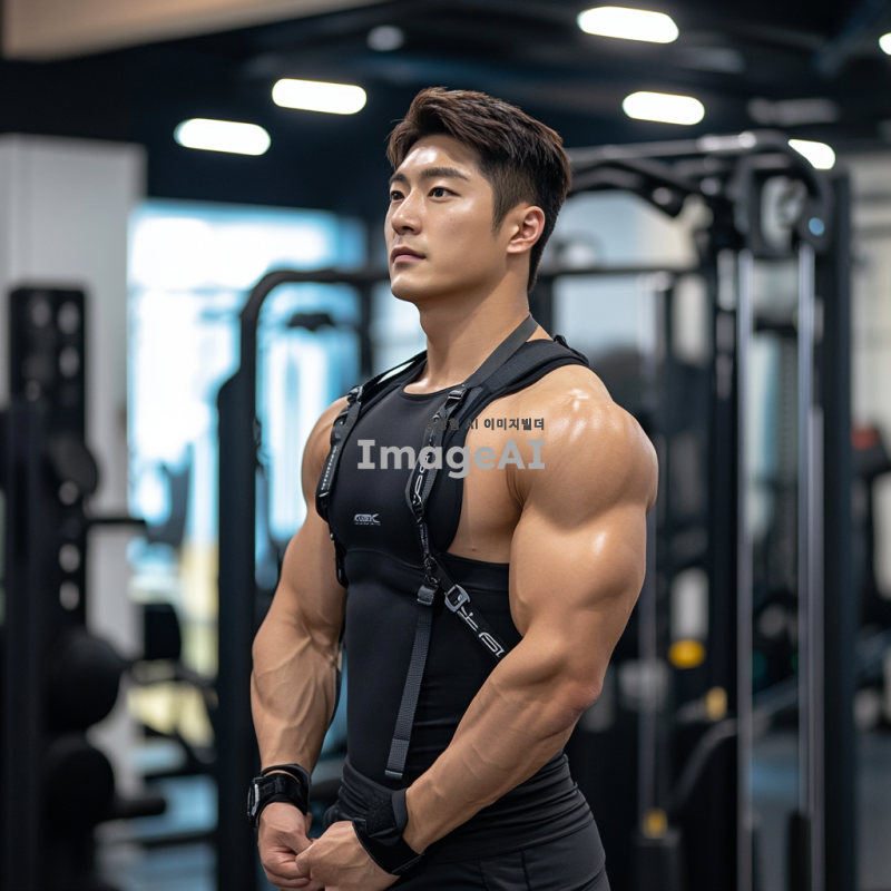 한국의 퍼스널 트레이너가 헬스장 안에서 운동을 지도하고 있는 모습. 트레이너는 근육질의 체형을 가지고 있으며, 운동복을 입고 있다. 다양한 운동 기구가 배경에 있고, 클라이언트와의 소통을 통해 운동 자세를 교정하는 장면을 포착한다. 밝고 활기찬 분위기에서 트레이너의 전문성과 열정이 느껴지도록 표현한다.