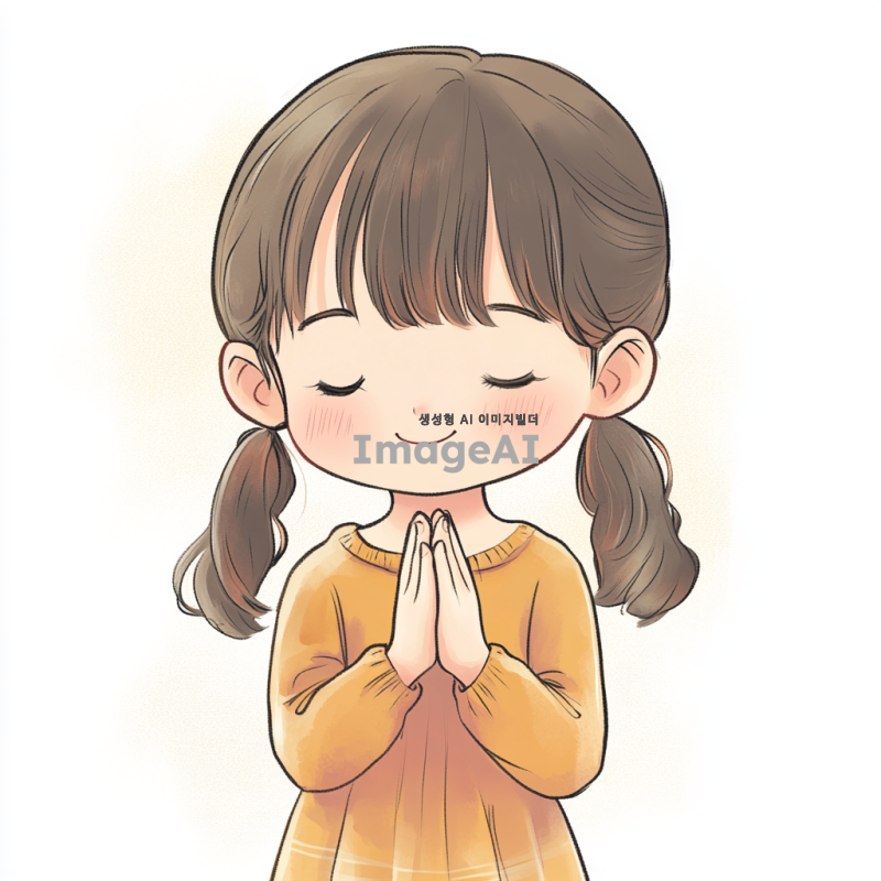 아무 배경 없이, 새해 소망을 기도하는 귀여운 여자 아이의 모습. 따뜻하고 손그림 느낌의 깔끔한 스타일2D 일러스트로, 아이는 밝고 행복한 표정을 지으며 두 손을 모으고 기도하는 자세.