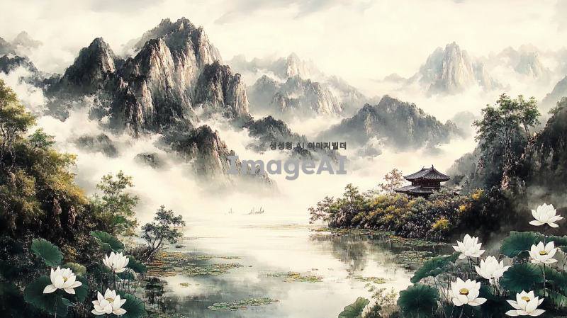 한국 전통 산수화 스타일의 풍경, 푸르른 산과 흐르는 강, 고요한 물가에 피어나는 연꽃, 전통 한옥이 어우러진 아름다운 자연, 부드러운 색감과 섬세한 붓터치, 고요한 분위기와 함께 한국의 전통미를 잘 표현한 장면