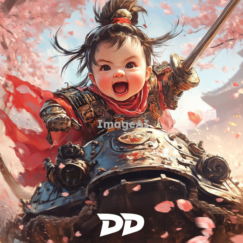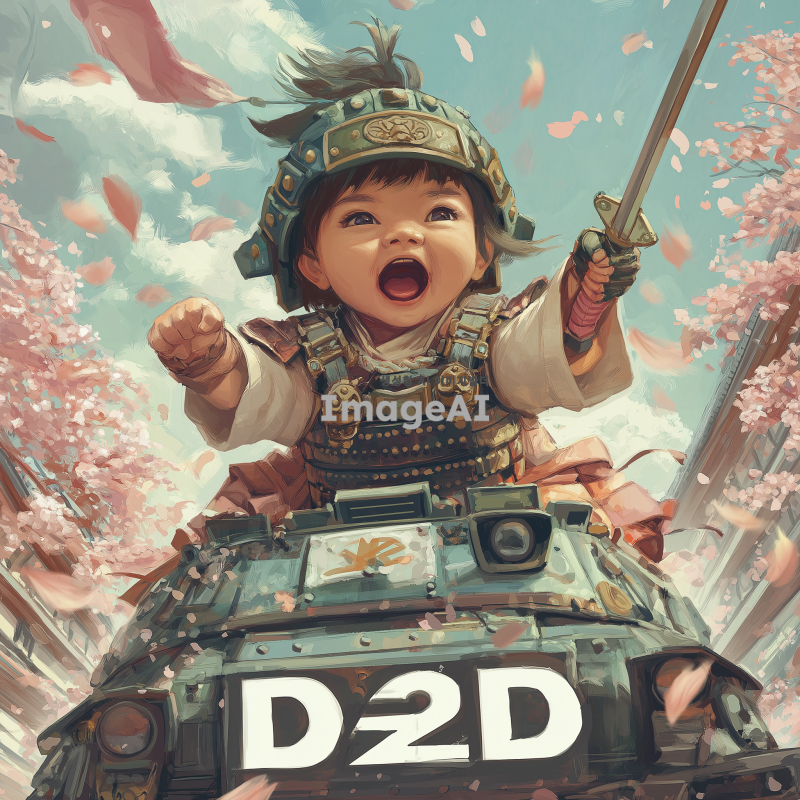 벚꽃잎이 휘날리는 아름다운 배경에서 탱크를 타고 있는 여자 아기 전사가 칼을 앞으로 내밀며 전진하라고 외치고 있는 모습. 아기는 멋진 갑옷을 착용하고 있으며, 하부에는 흰색으로 'd2d'라는 글자가 임팩트 있게 들어가 있다.