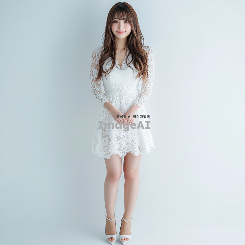 매력적인 일본 여성의 전신 사진, 흰색 레이스 드레스와 하이힐을 신고 있다. 그녀는 얼굴을 감싸는 앞머리와 긴 머리를 가지고 있으며, 카메라를 향해 부드럽게 미소 짓고 있다. 배경은 그녀의 특징을 강조하기 위해 단순한 흰색이다. 그녀의 자세는 카메라 앞에서 자신감을 발산하며 곧게 서 있다.