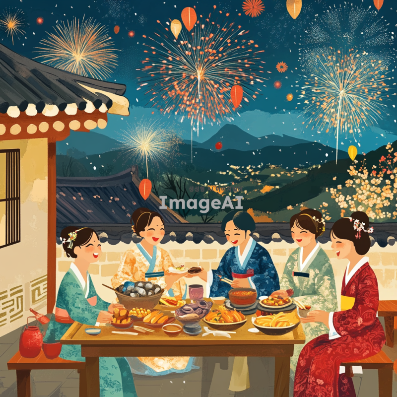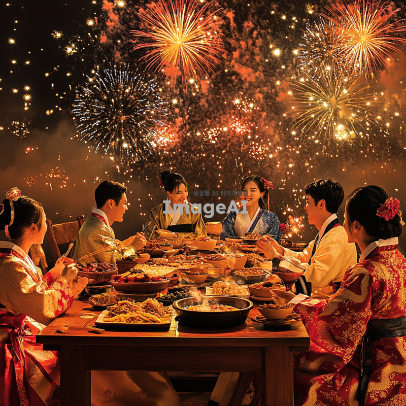 2025년 뱀의 해를 맞아 축하하는 한국 전통 새해 풍경, 화려한 뱀 모티프의 장식과 함께 새해를 기념하는 사람들, 전통 한복을 입은 가족들이 모여 웃으며 새해 인사를 나누고 있는 모습, 따뜻한 조명과 함께 풍성한 음식들이 차려진 테이블, 배경에는 불꽃놀이가 펼쳐지는 밤하늘, 행복하고 화목한 분위기.