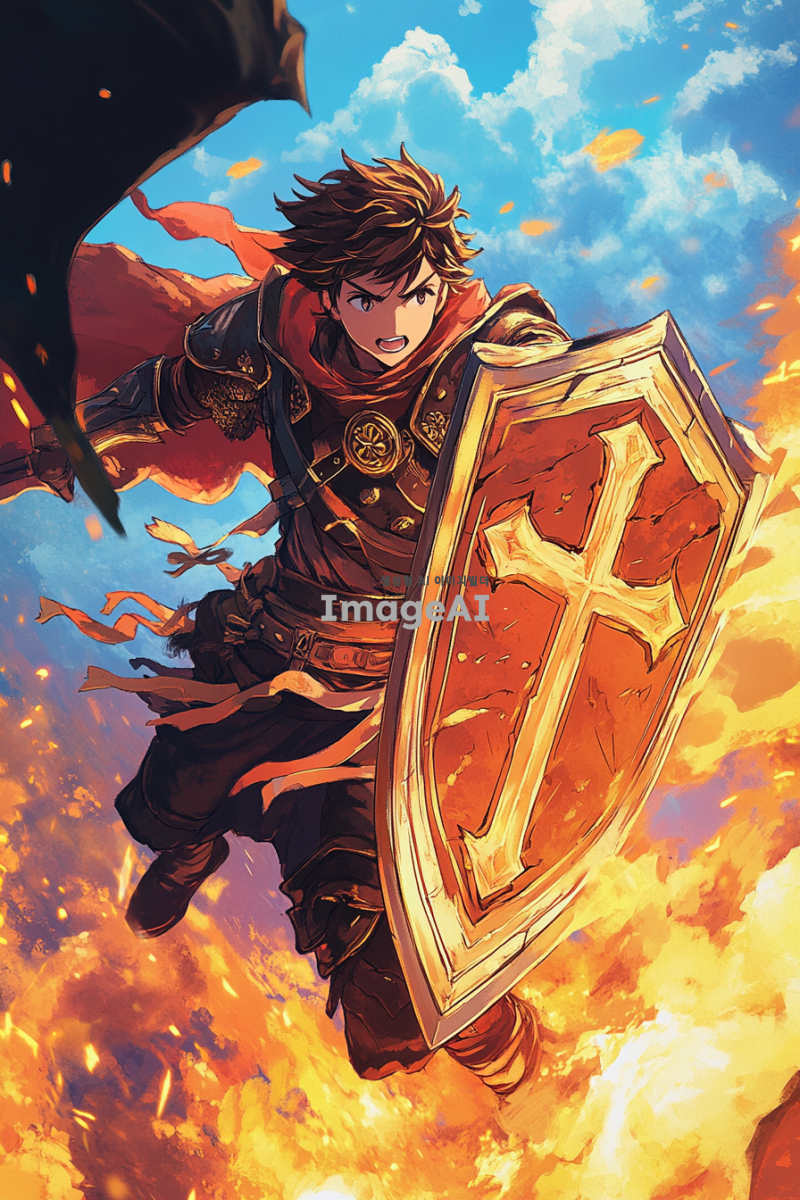이세계물 소설책 표지에 들어갈 이미지. 남자 용사가 흑룡이 쏘는 불꽃을 커다란 직사각형 방패로 막고 있음. 직사각형 방패에는 십자 모양의 무늬가 있음. 배경은 주변이 모두 불타고 있는 상황. 2D 애니메이션으로 표현해주세요.