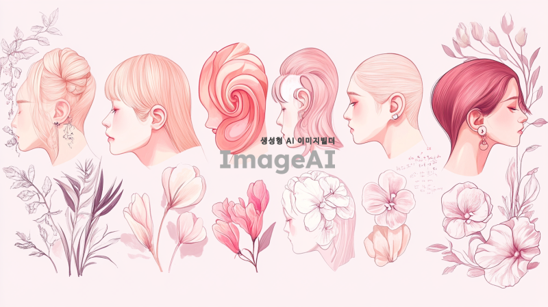귀를 주제로 한 일러스트를 그려주세요. 다양한 스타일의 귀를 표현하며, 귀의 형태와 디테일을 강조해 주세요. 귀가 여러 가지 색상으로 채색되어 있고, 주변에 자연 요소나 장식이 함께 어우러져 있는 모습으로, 한국적인 느낌이 나는 배경을 추가해 주세요. 귀의 아름다움과 독특함을 잘 나타내는 그림이 되길 바랍니다.