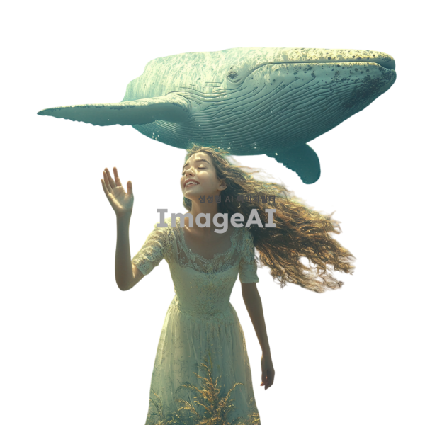 끝없는 초원 한가운데에 서 있는 소녀가 손을 흔들며 우리에게 미소를 짓고 있다. 그녀 앞에는 물속에 잠긴 몽 생 미셸이 있고, 그 위에는 거대한 흰 고래가 떠 있다. 이 초현실적인 사진은 꿈같고 부드러운 조명, 밝은 색상, 복잡한 디테일, 높은 해상도를 특징으로 한다.