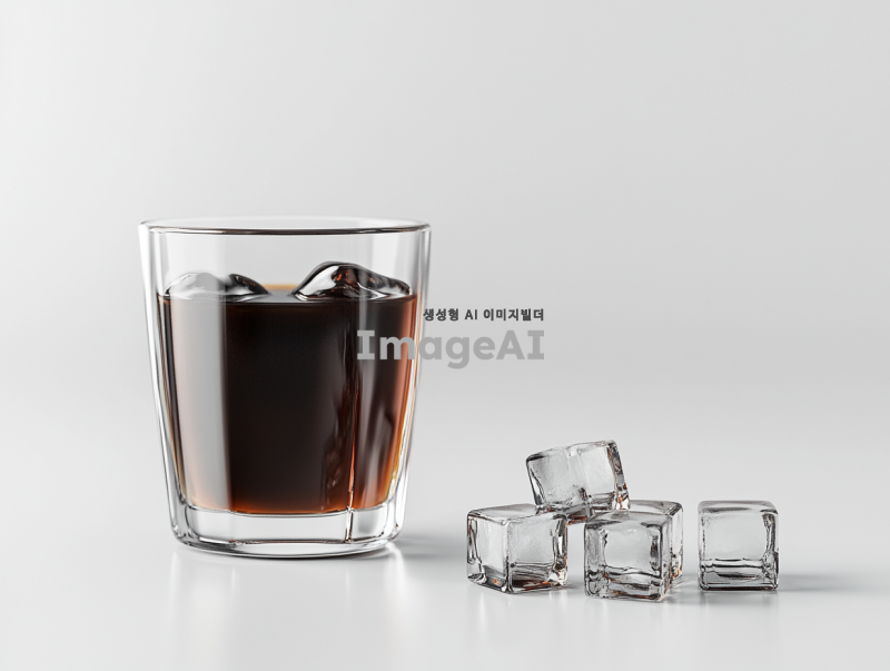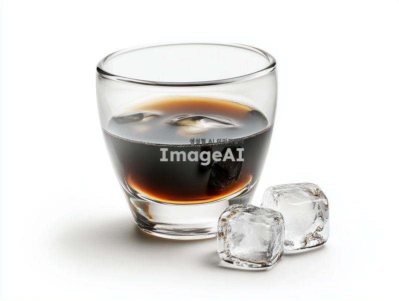 차가운 블랙 커피가 얼음 조각과 함께 담긴 유리잔을 흰 배경에 두고 촬영한 고해상도 사진, 고품질 사진, 고화질 리얼리틱, 제품 촬영, 제품 사진, 매우 상세하고 높은 초점의 사진입니다.