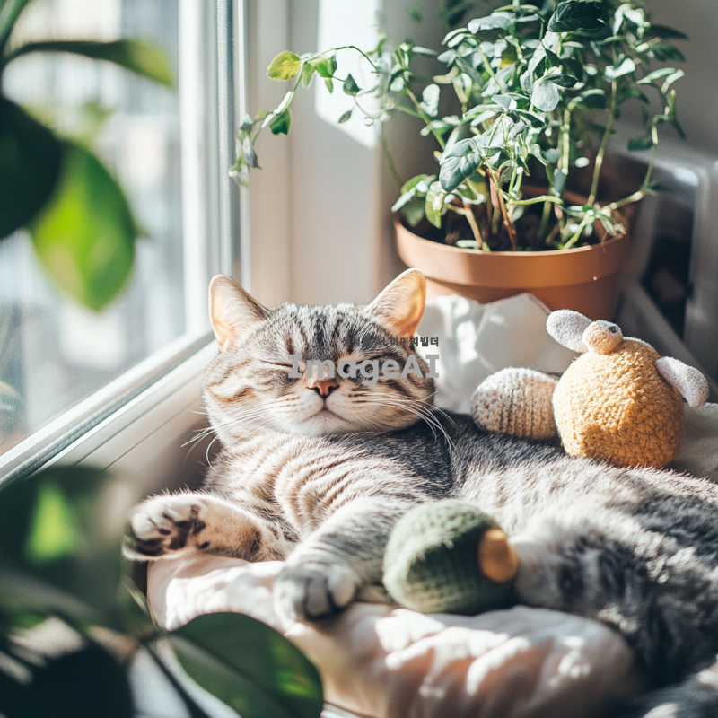 귀여운 고양이가 편안하게 누워 있는 모습, 부드러운 털과 큰 눈, 햇빛이 비치는 창가에서 졸고 있는 장면, 주변에는 아기자기한 장난감과 식물이 있는 아늑한 실내 환경, 따뜻한 색감으로 포근한 분위기 연출.