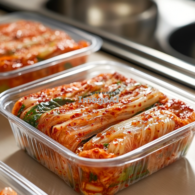 일회용 용기에 담긴 김치, 신선한 재료와 매콤한 양념이 어우러진 모습, 한국의 전통적인 김치 스타일, 배경은 깔끔한 주방, 자연광이 비치는 분위기, 고급스러운 느낌의 음식 사진.