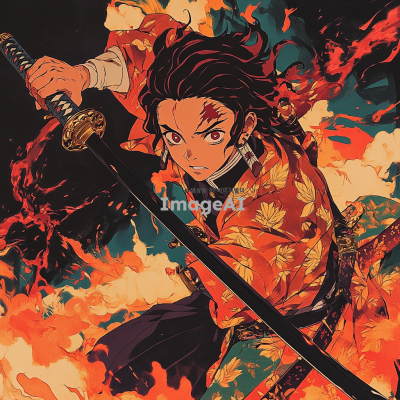 귀멸의 칼날의 탄지로를 중심으로 한 장면, 전통적인 일본의 배경 속에서 검을 들고 있는 모습, 강한 결의가 담긴 표정, 화려한 색감의 기모노를 입고 있으며, 주변에는 불꽃과 연기가 감도는 모습, 신비로운 분위기와 함께 전투 준비 자세를 취하고 있는 모습.