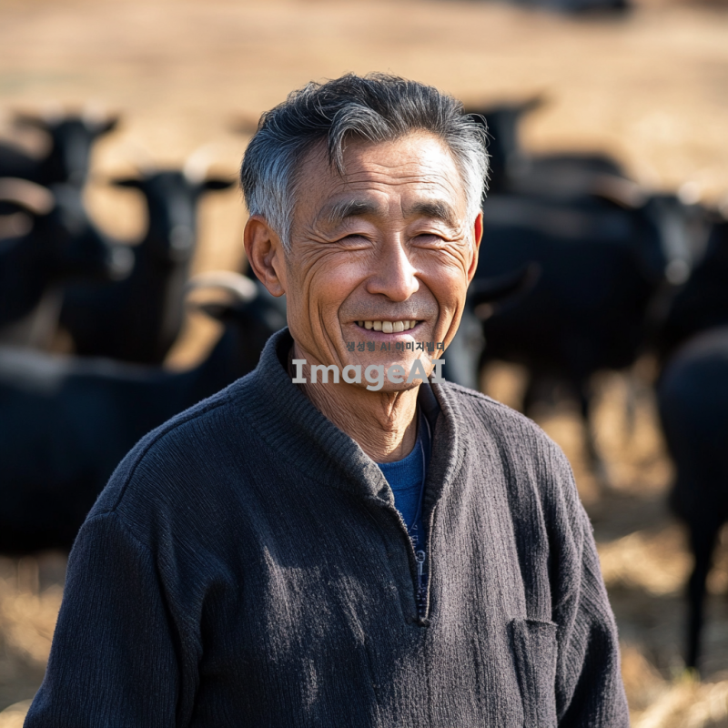 ai 이미지는 신뢰성을 주기 위해 배경은 흑염소 농장 같은곳에서 60~70대 정도의 남자가 인자하게 웃는 느낌으로 만들고 싶어