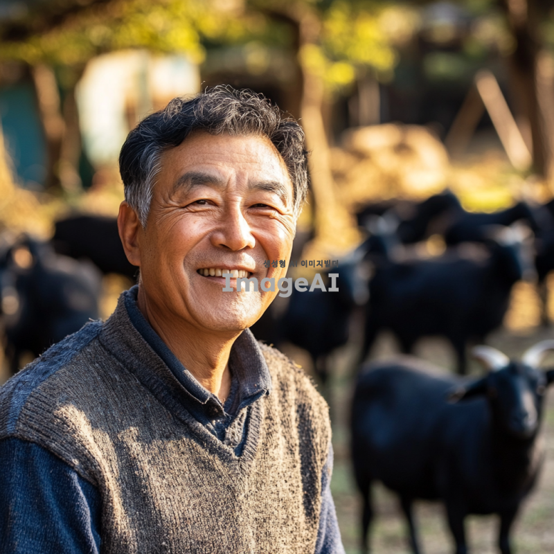 흑염소 농장에서 60대에서 70대 정도의 한국인 남성이 인자하게 웃고 있는 모습, 배경에는 건강한 흑염소들이 자연스럽게 풀을 뜯고 있는 풍경, 따뜻한 햇살이 비치는 평화로운 분위기, 신뢰감과 편안함을 주는 이미지.